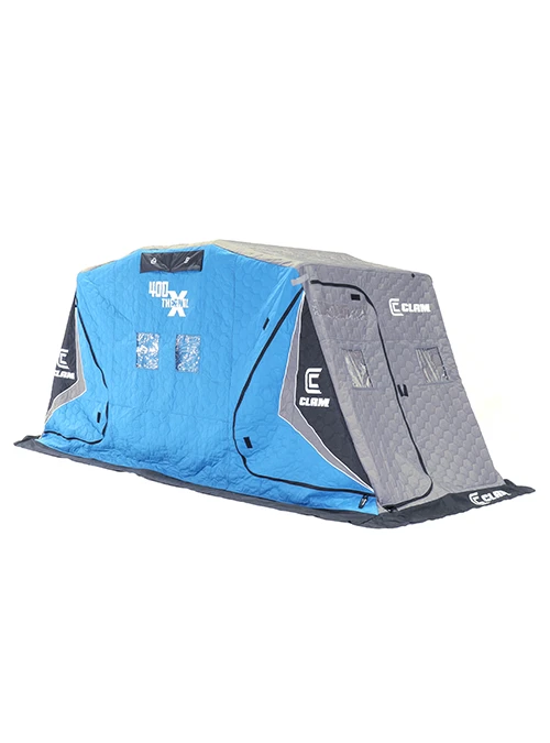 The X400 Thermal XT is perfect for ice anglers who want to go ice fishing with their friends and family and stay warm and comfortable. This shelter is constructed with a full thermal skin, has all of the features like our thickest poles and tub for anglers that need the most rugged ice fishing shelter but want to go with others. Our largest flip-over fish house, the X400, has a whopping total of 68 square feet of fishable space! It also includes two lights sticks, deluxe seating for four, and a 1 ÂĽ pole system. The X400 Thermal flip-over shelter by Clam Outdoors is the ultimate in space, comfort, and durability.